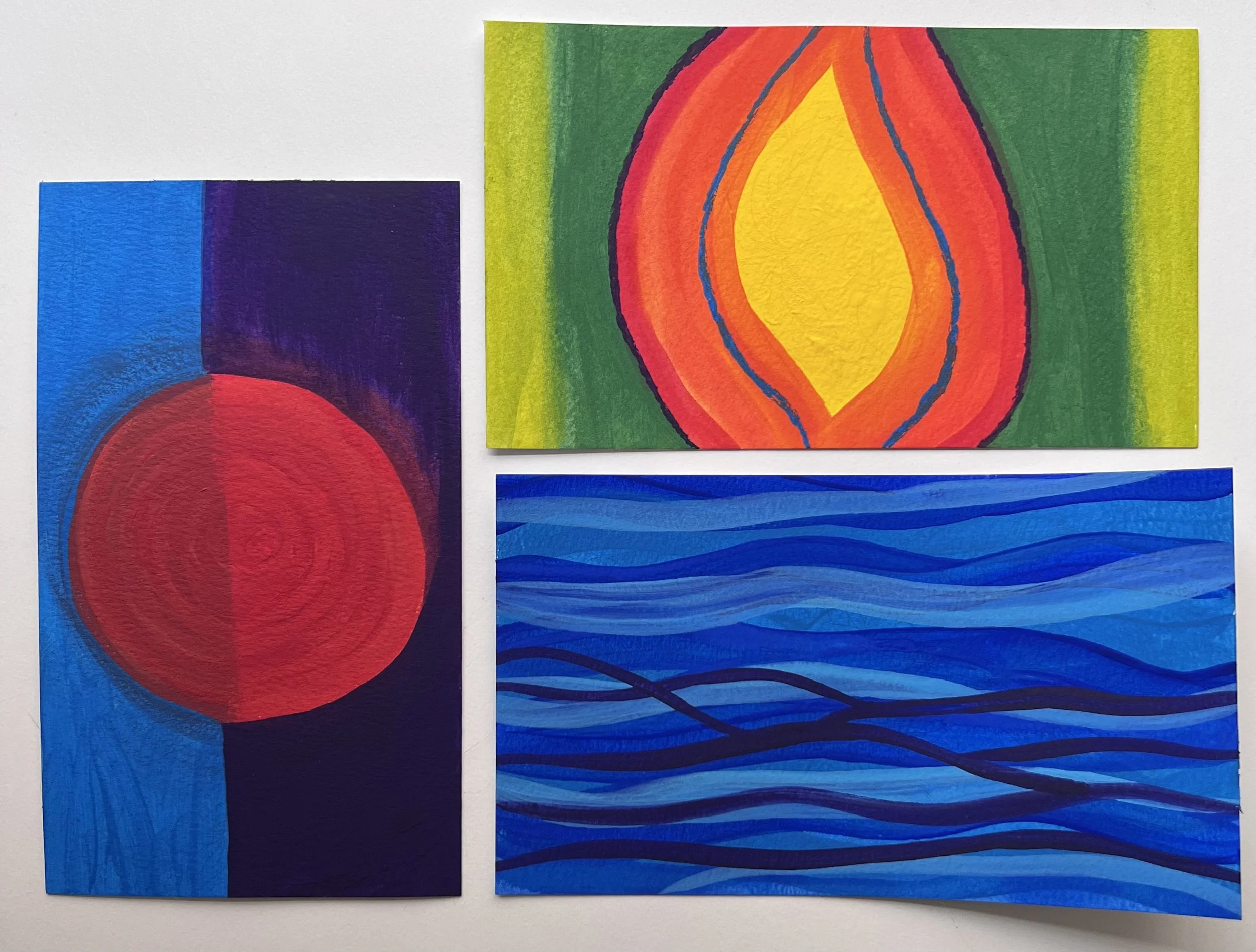 There are three paintings representing strengths based on aspects of nature. The image on the left shows a circle in blue, red and purple. The image on the top right shows a seed in yellow, orange, blue, red, purple and greens. The image on the bottom right shows waves representing water in various shades of blue. All images were made by Jennifer Burkett while in her last year of graduate school for art therapy.